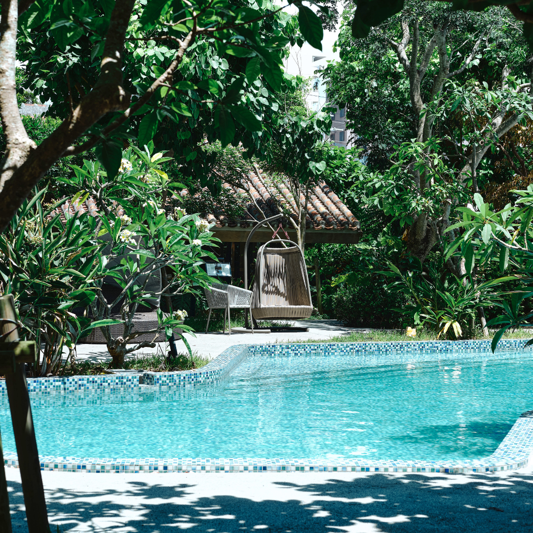 鮮やかな自然に囲まれ過ごせるガーデンプール。
