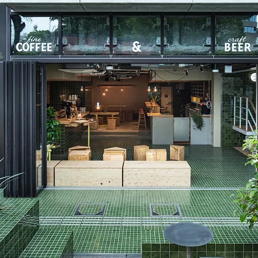 グリーンが印象的なタイルやドットのロゴ。