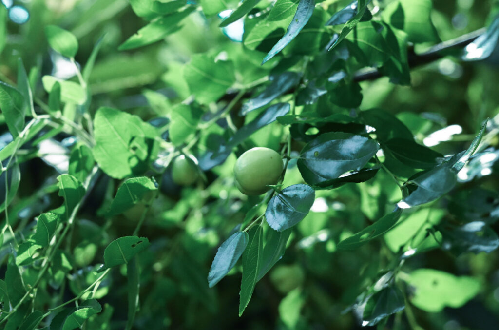 なつめ。薬膳食材で、最近ではスーパーフードと呼ばれるほどの栄養価を持つと言われています。今はオリーブ色ですが9月頃には赤く熟します。