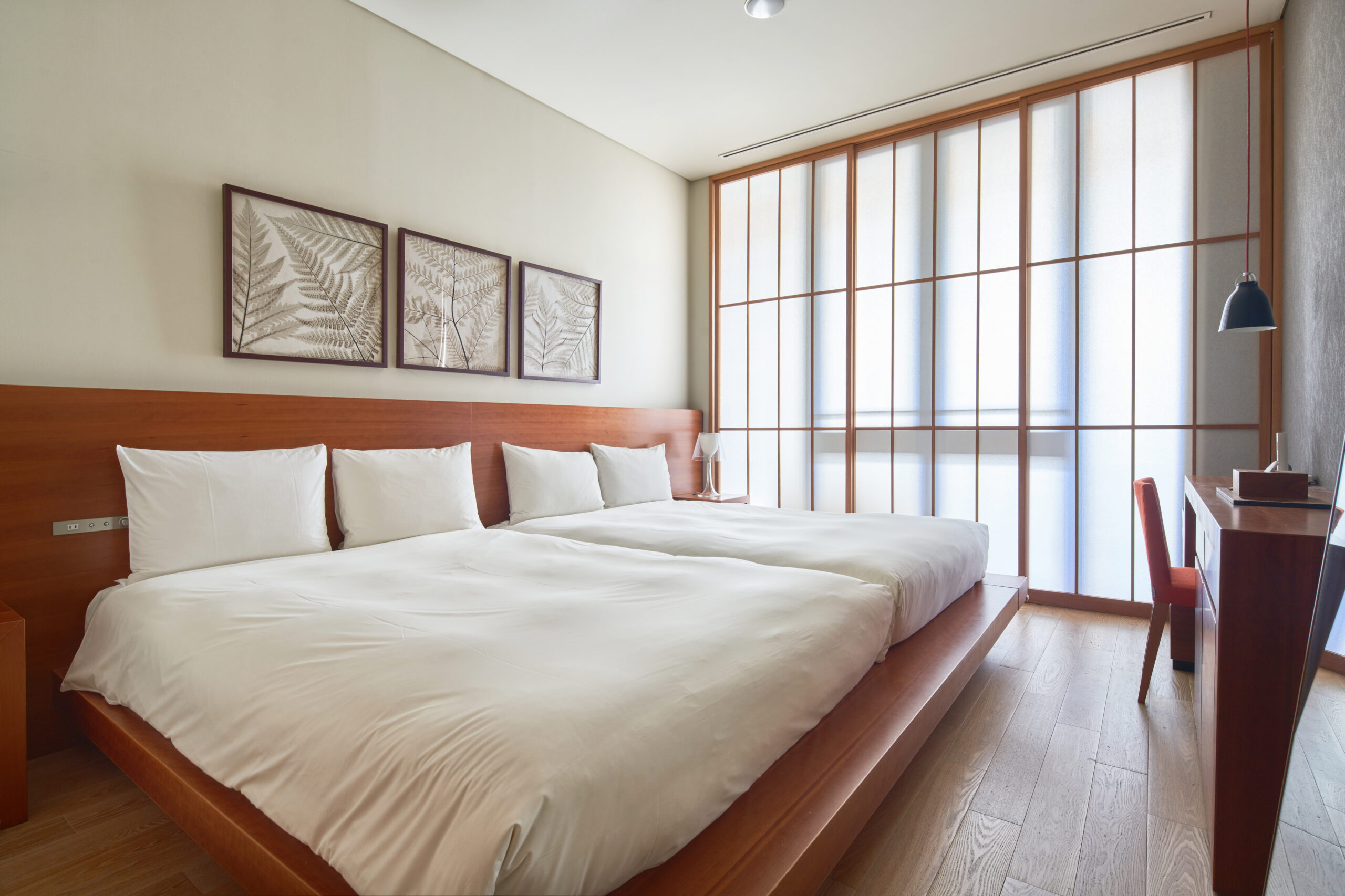 日本のモダンインテリアを牽引するブランド「ACTUS」(アクタス)がプロデュースを手掛けたメゾネットタイプの客室です。客室に入ると1階にハリウッドツインのベッドスペース、階段から地下1階へ降りた先のリビング・テラススペースには、ACTUSならではのライフスタイルへのこだわりが随所に散りばめられており、おふたりでゆったりとお過ごしいただけます。