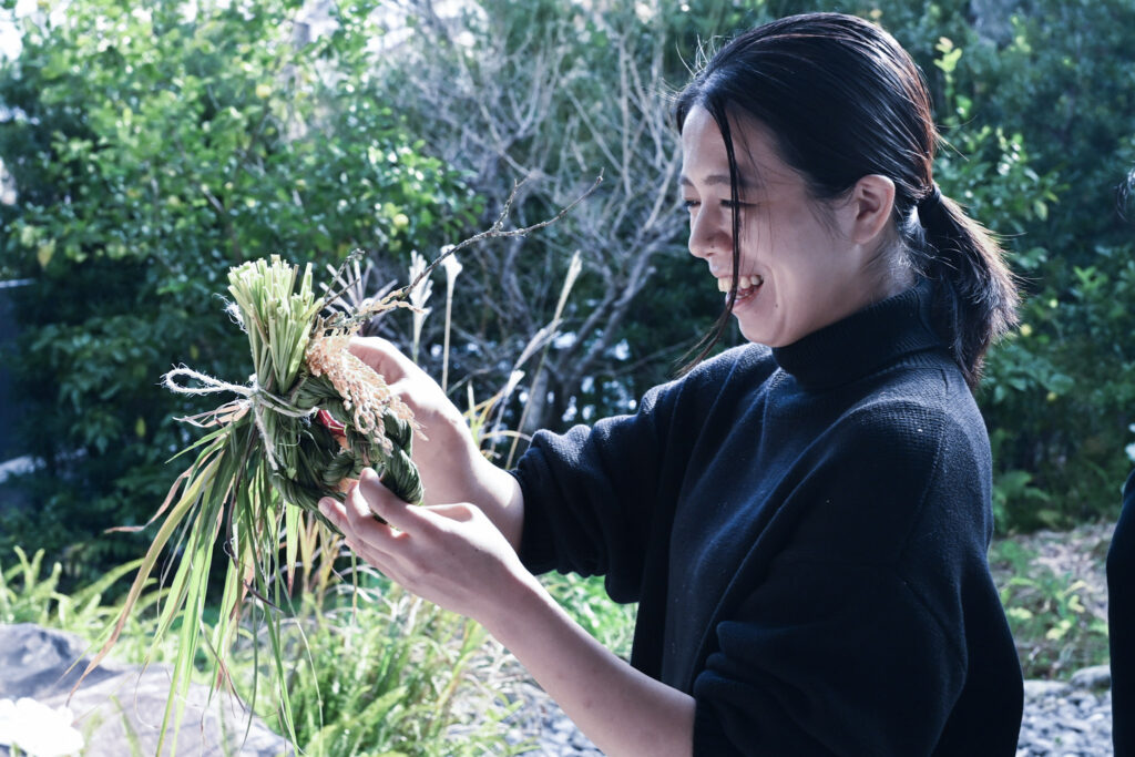 しめ縄には、瓢箪、苔枝、稲穂など地域で採れたものを中心に、縁起物や魔除けの植物素材を飾りつけて仕上げていきます。