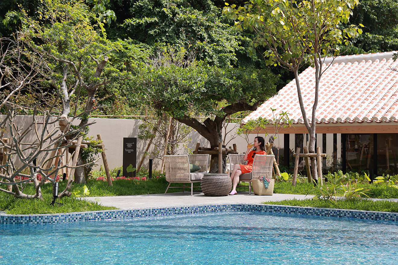 琉球の森をイメージした緑豊かな中庭には、全長約14mの屋外プールと子ども用プールを設けています。日常の喧騒を忘れリゾート気分をご満喫ください。