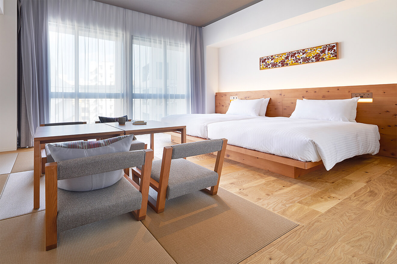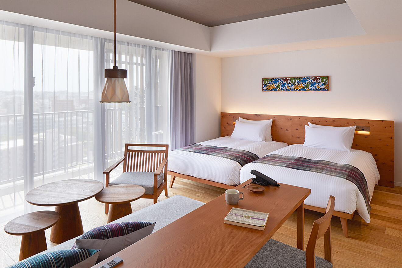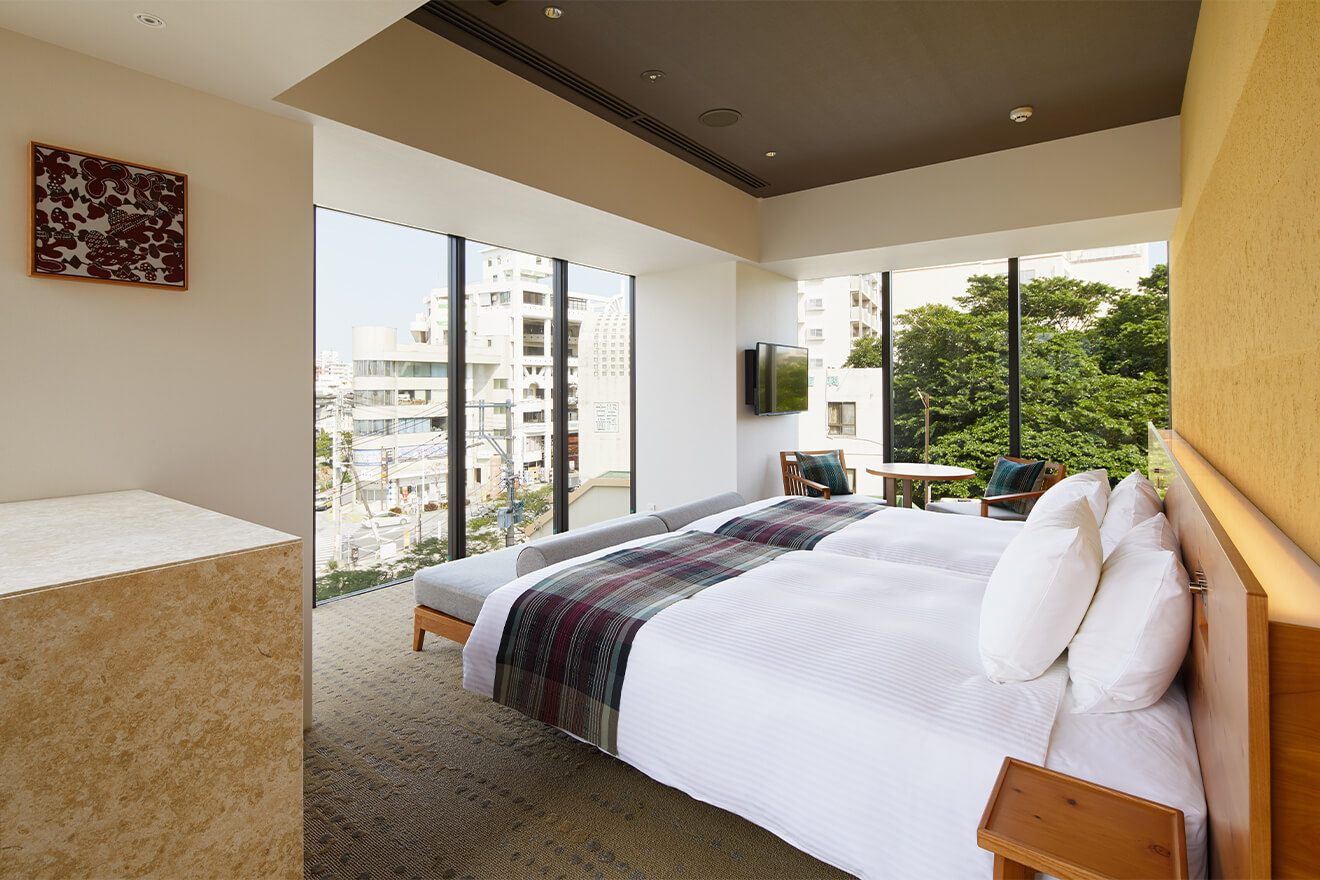 コンパクトながらも140cm幅のダブルベッドをご用意し、機能的でビジネスでのご利用にもおすすめ。工芸とコラボレーションした客室備品も取り揃え、沖縄らしさも感じられるデザインのお部屋です。(浴室はレインシャワー付きのシャワーブースのみとなります。)