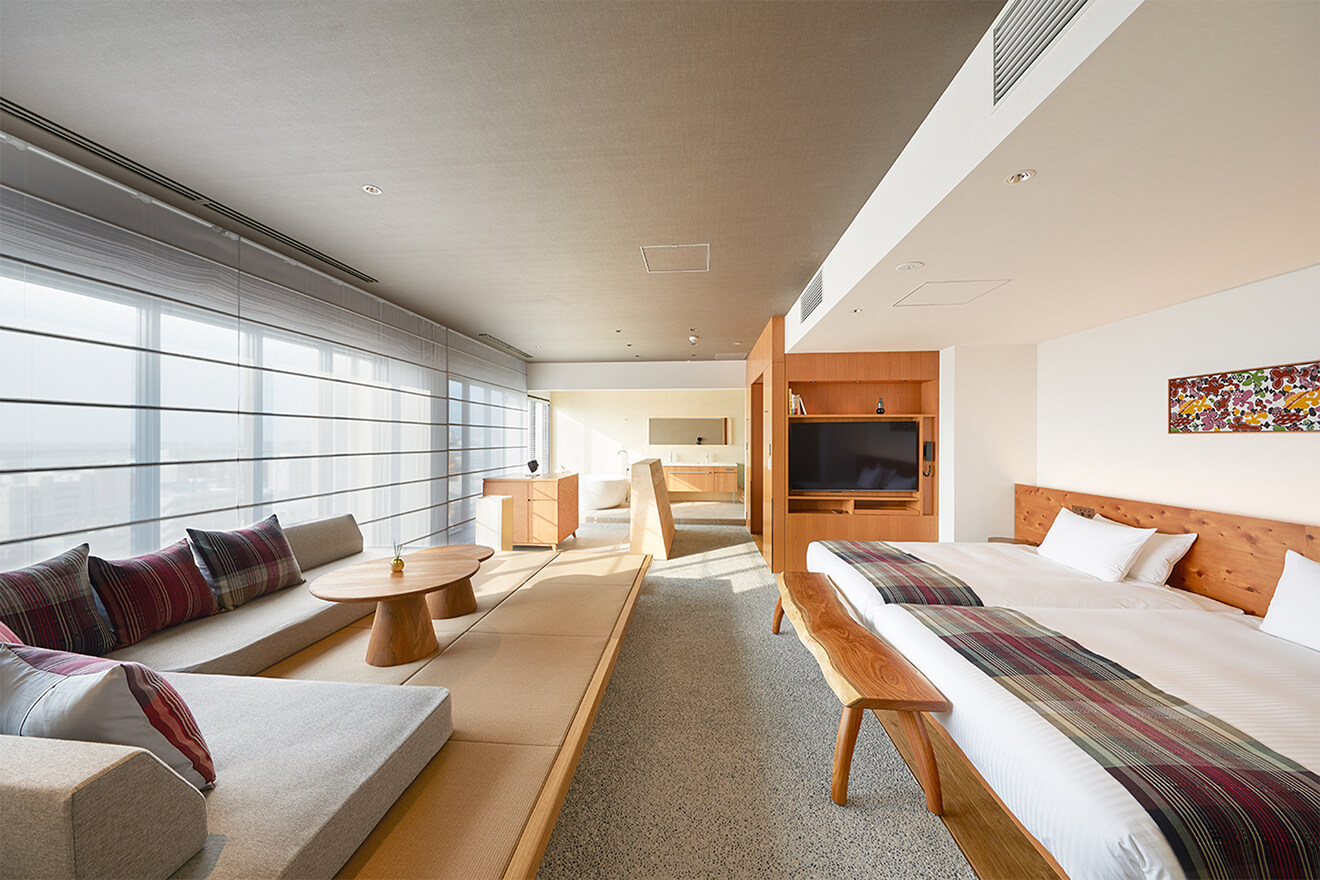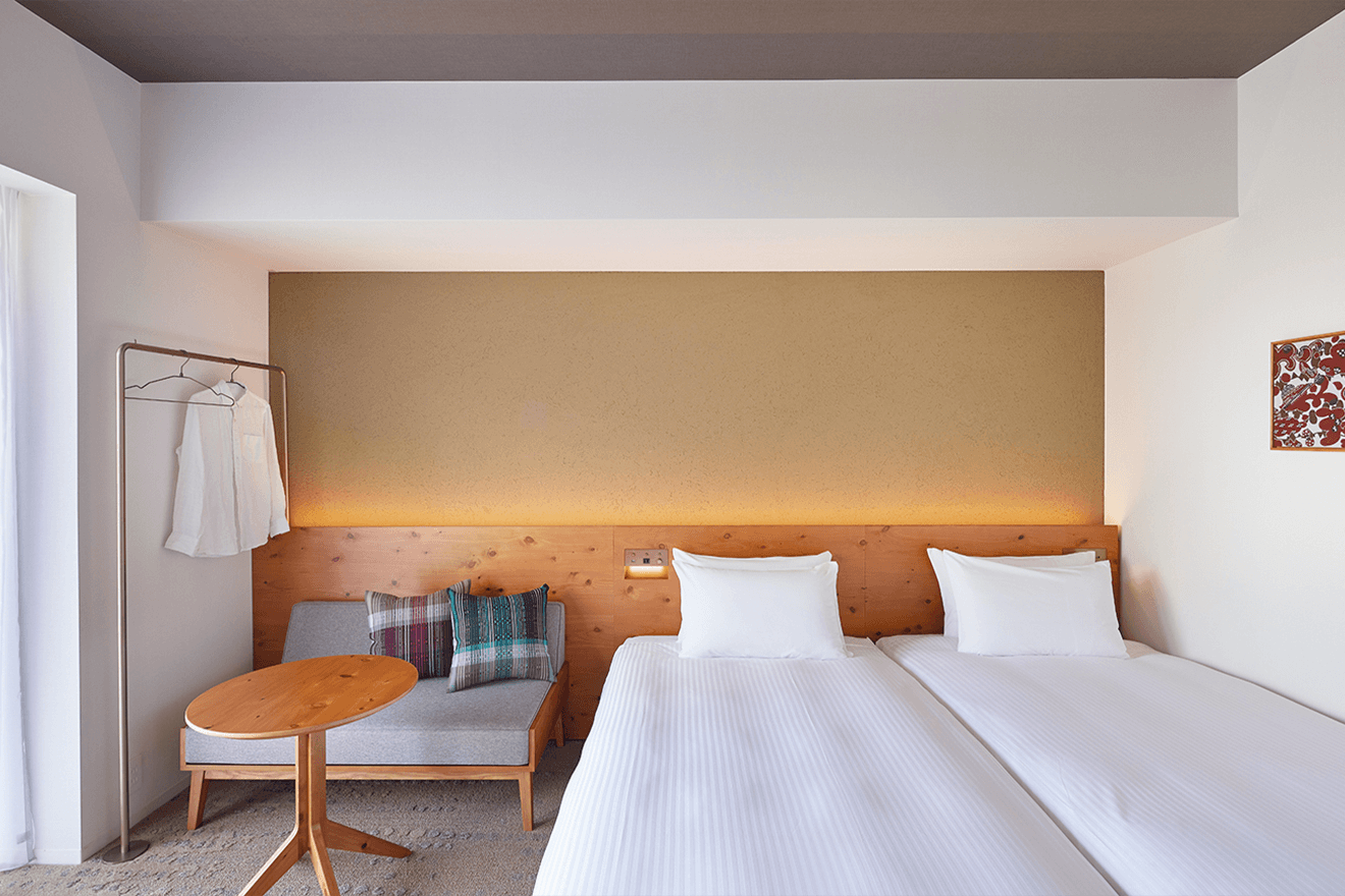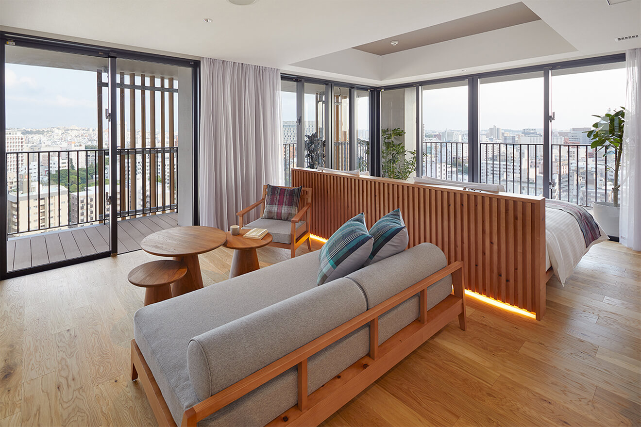 コンパクトながらも140cm幅のダブルベッドをご用意し、機能的でビジネスでのご利用にもおすすめ。工芸とコラボレーションした客室備品も取り揃え、沖縄らしさも感じられるデザインのお部屋です。(浴室はレインシャワー付きのシャワーブースのみとなります。)