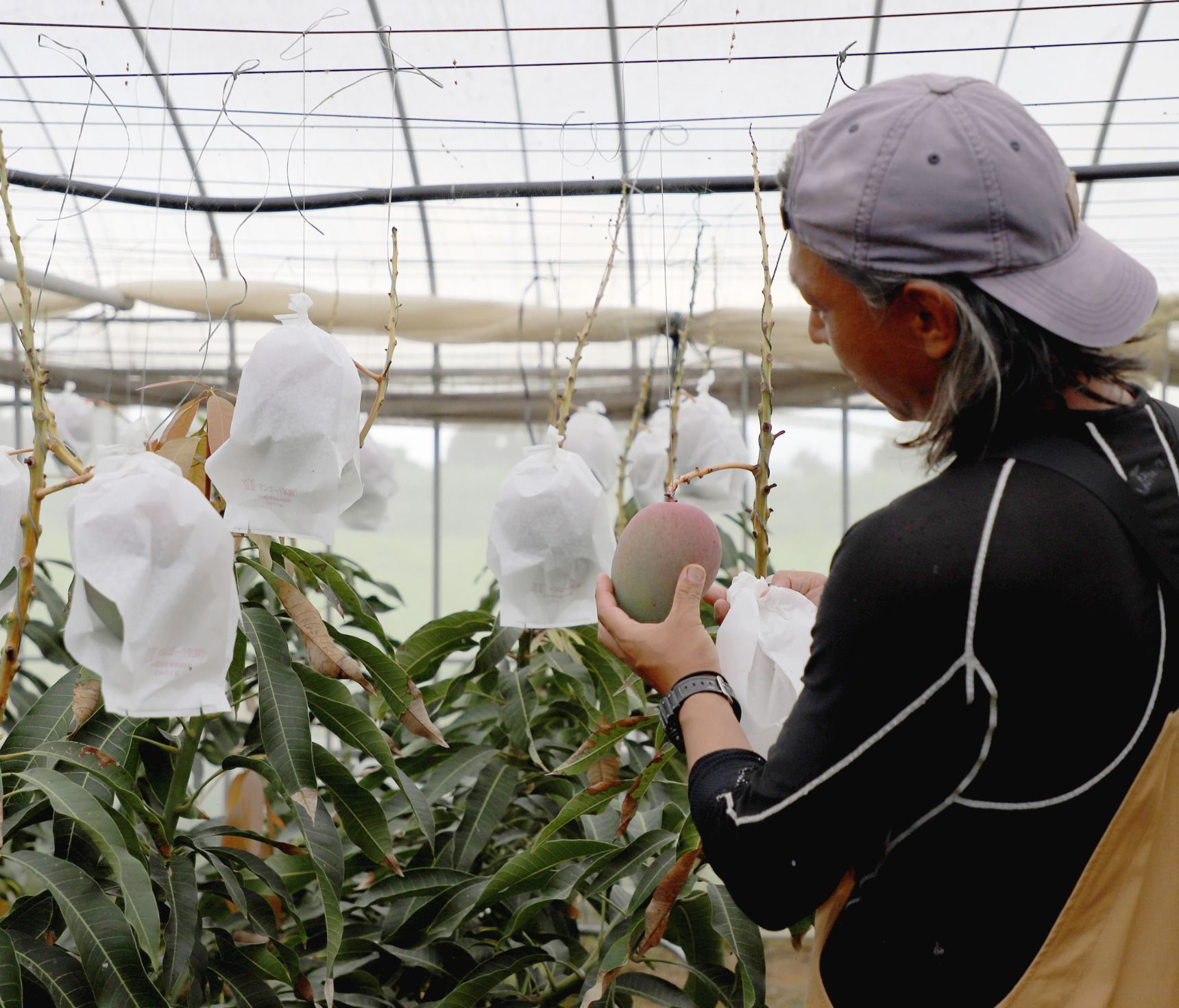 丁度取材時は、マンゴーを強い日差しや虫から守る袋掛けの真っ最中だった。一つ一つ丁寧に袋をかけていく。